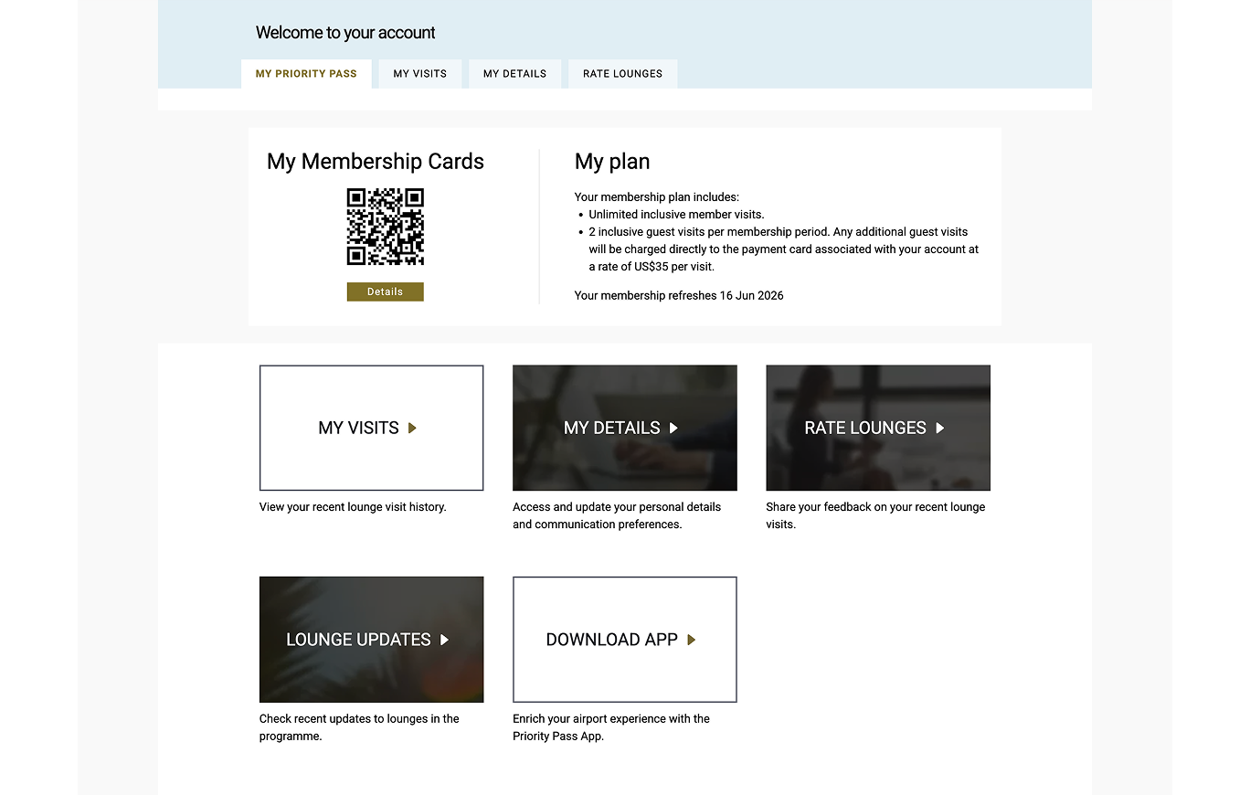 Welcome to Priority Pass. As a Priority Pass Member you are now entitled to the following benefits via both our website and app: