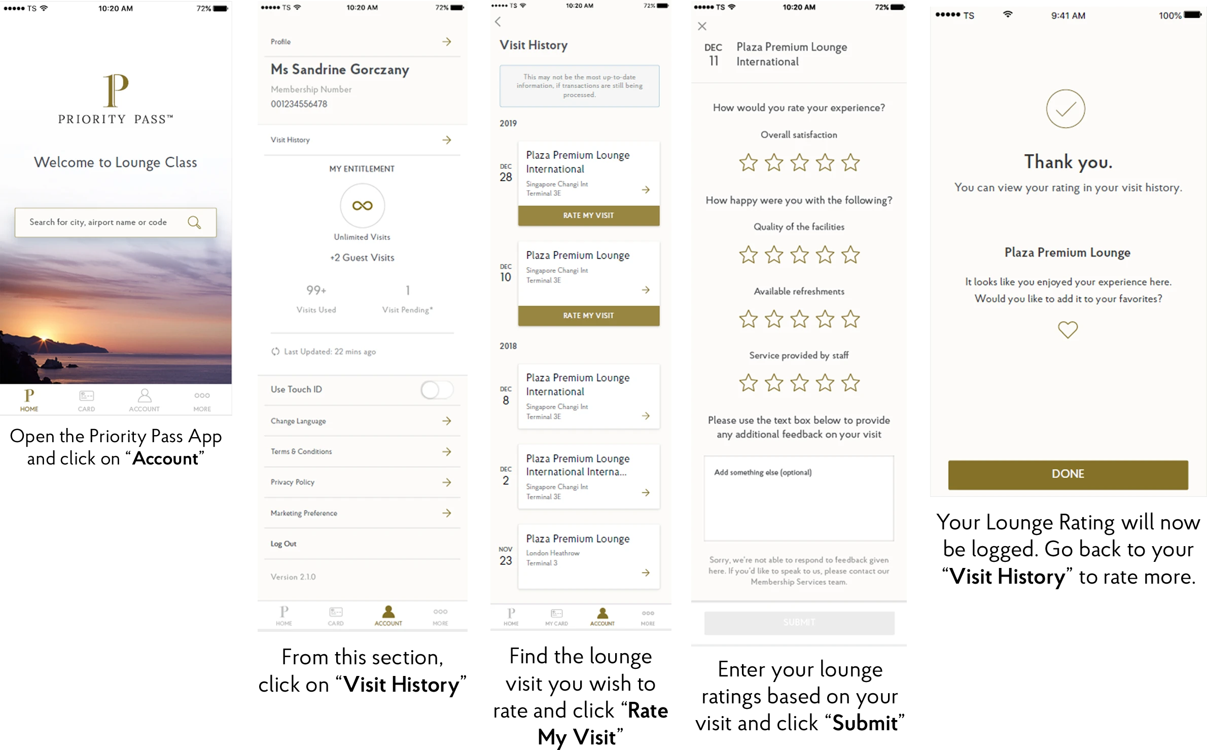 To rate a lounge on the Priority Pass app, log in then follow these simple steps: