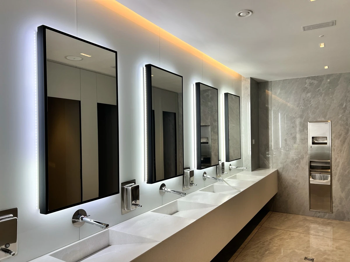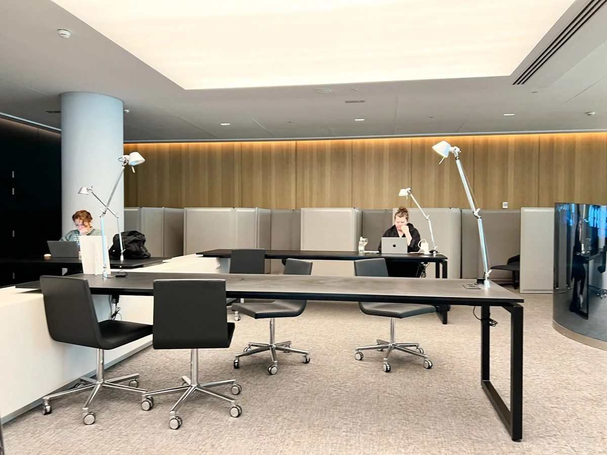 A wide range of seating caters to differing needs, including more casual sofas and armchairs in the windows arranged in groups of three, four or five. On the left, seven large hot-desking style work areas were very popular with business travellers and is something that could be replicated at many other lounges. Adjacent to this were multiple more private booths, as well as three circular booths shrouded in blue glass privacy screens.