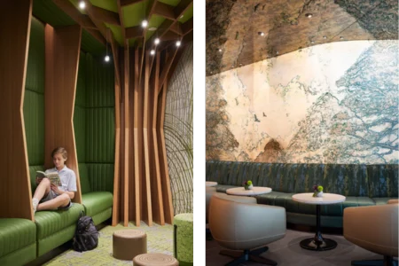 The reception area, with its dark stone and light quartz, mimics the natural beauty of Northern California, while the towering wood wall adorned with an etched canopy of leaves adds a touch of whimsy. Nearby, a curio shelf and sheltered seating area offer a cosy spot for those waiting on friends or simply wishing to take in the surroundings.