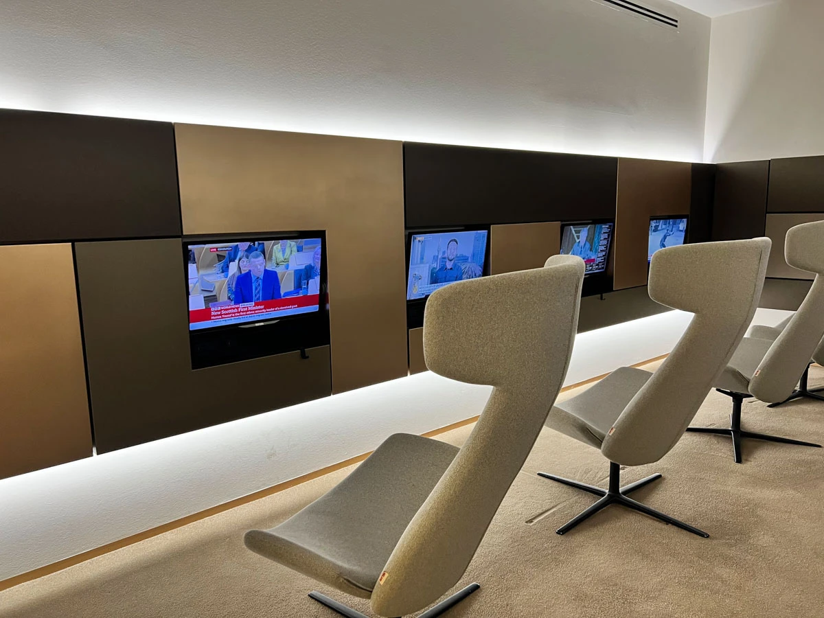 В дальней левой части бизнес-зал был расширен за счет соседнего помещения: по-видимому, это служит дополнительным пространством в часы пик. Здесь также предлагается ряд кабинок, предназначенных для деловых путешественников, с большим количеством электрических розеток по всему пространству.