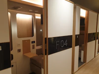 Each private suite features a full-length bed, plush bedding, ambient lighting, and charging ports - everything you need to recharge without leaving the terminal. Whether you're on a long layover or catching a red-eye, it's a restful upgrade from noisy gates and crowded lounges.